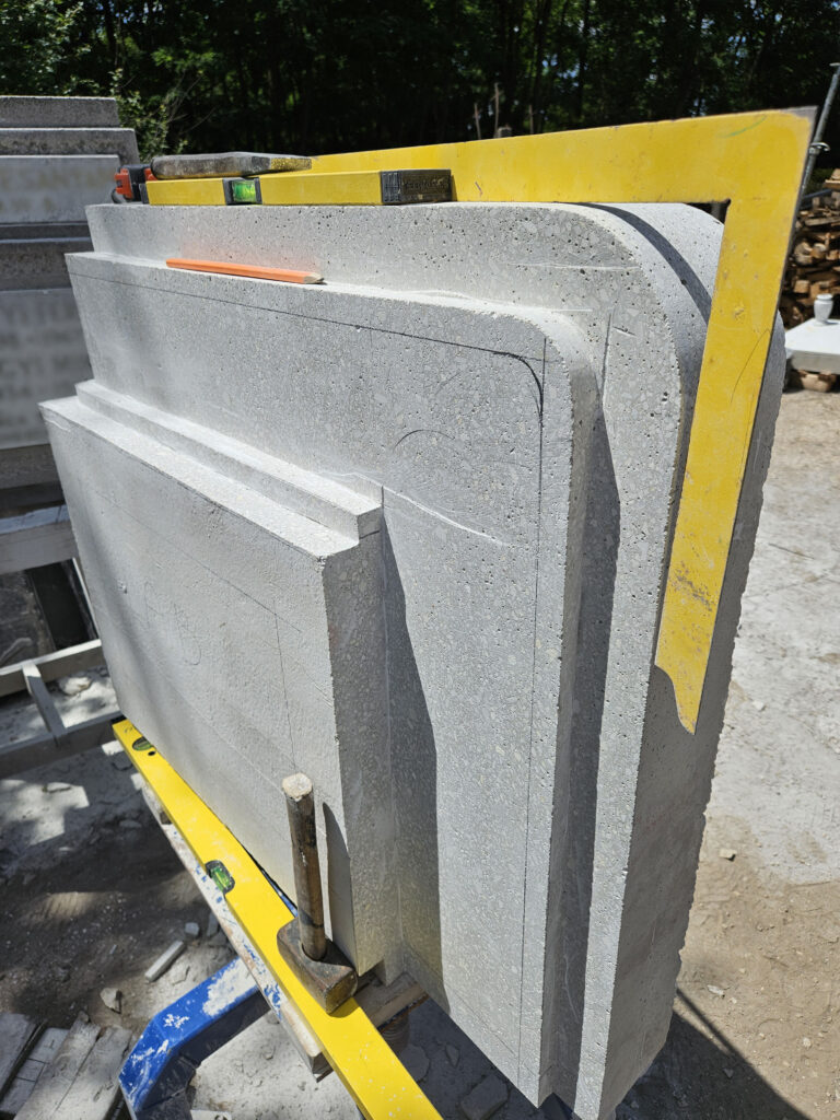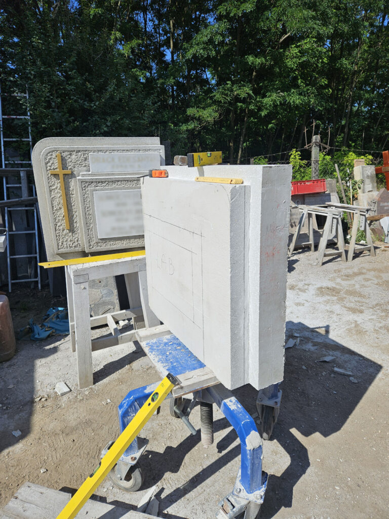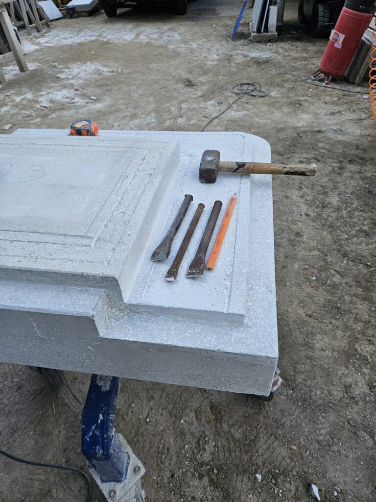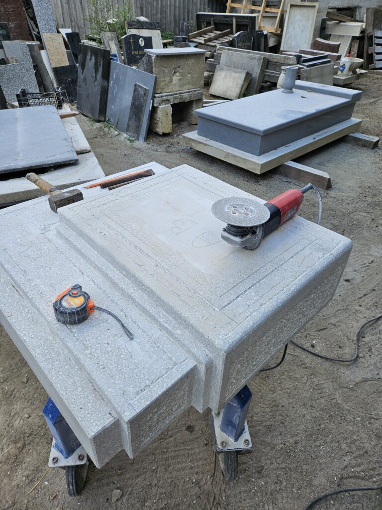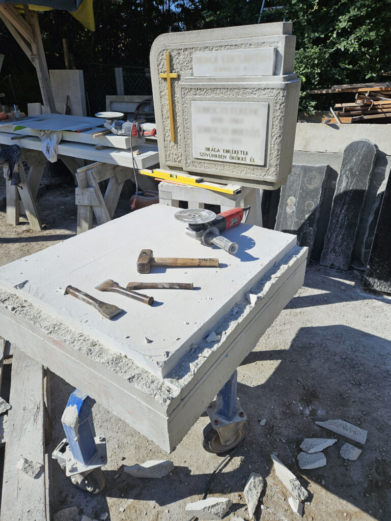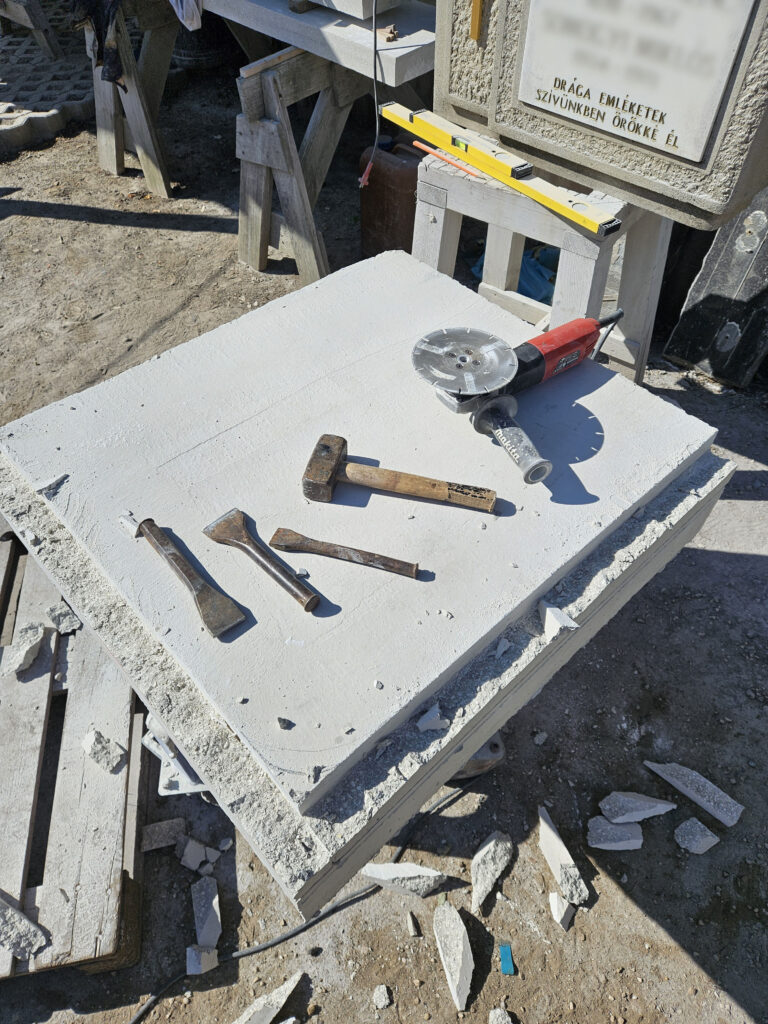 A képeken egy sírkő készítésének néhány pillanata látható. Ez nem a teljes munkafolyamat, hiszen minden sírkő más és más, attól függően, milyen formát, anyagot vagy részletet kérnek.